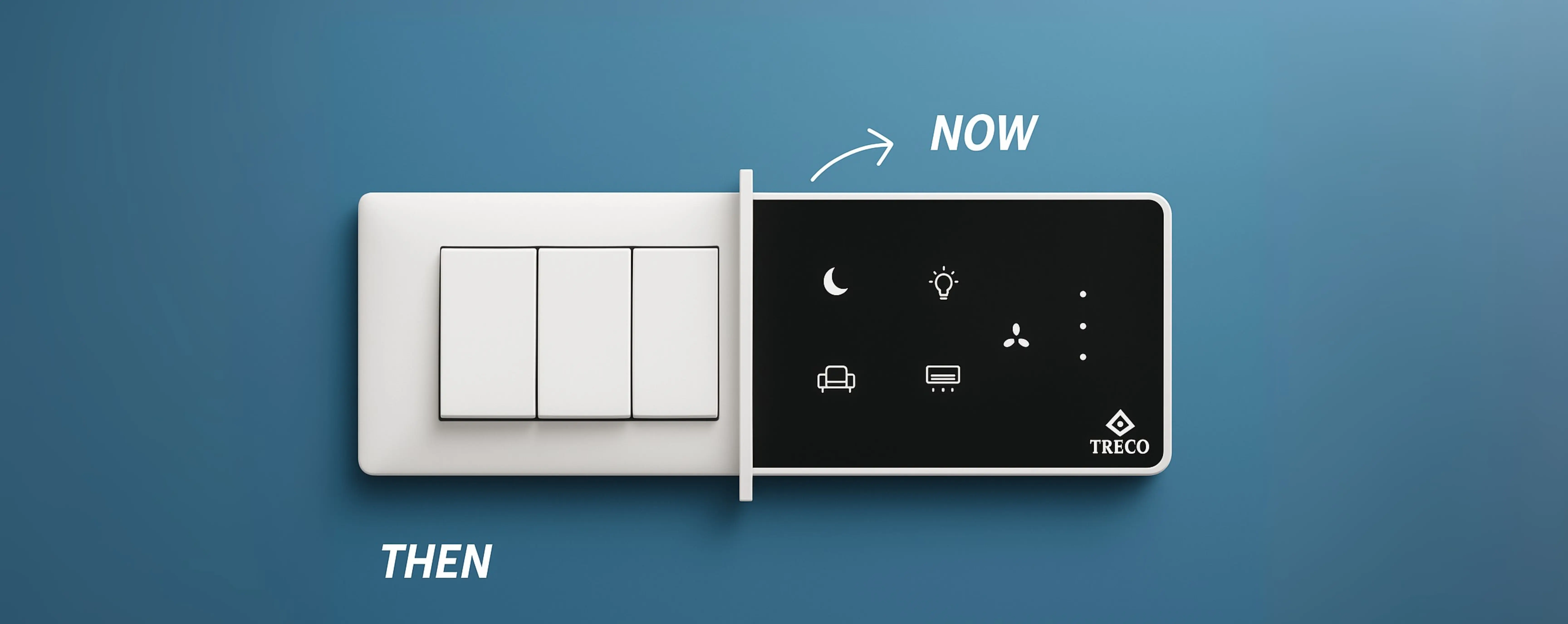 TRECO offers complete smart home automation solutions including touch switches, modular switches, motion sensors, smart modules, curtain/blind motors, lighting automation, and audio-visual integration.